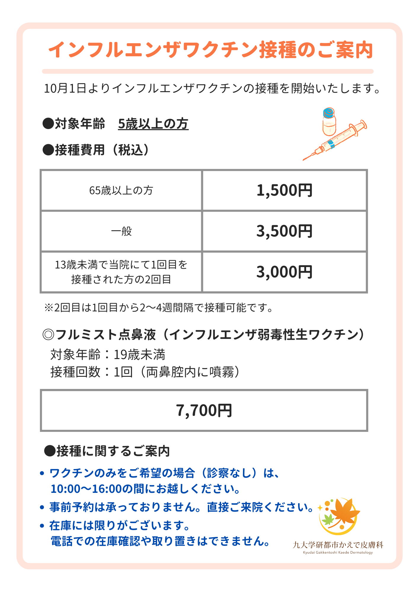当院では 10月1日よりインフルエンザワクチン接種 を開始いたします。