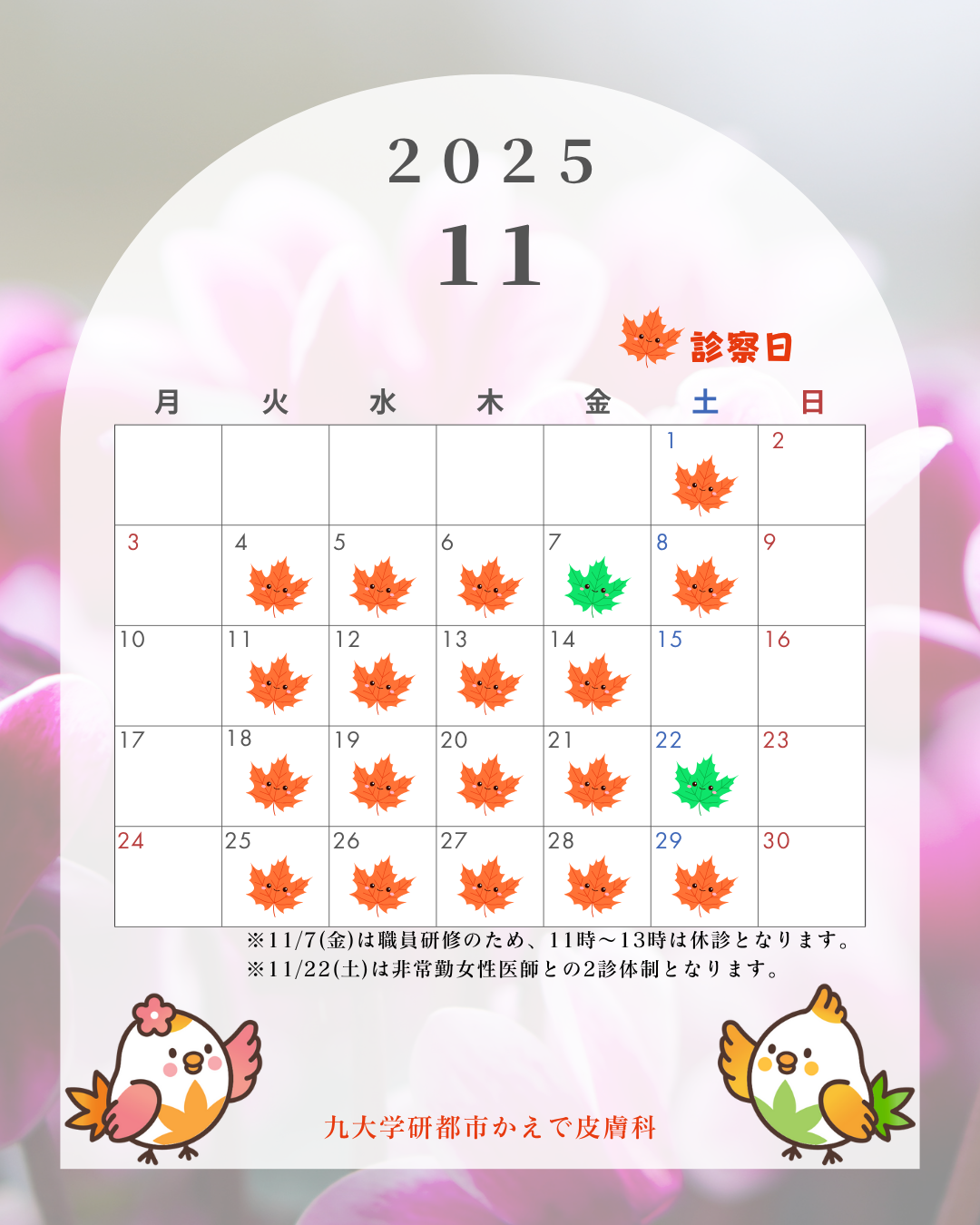 ・11/7(金):職員研修のため、午前は11:00までの診療となります。(午後は通常通り14:00〜)