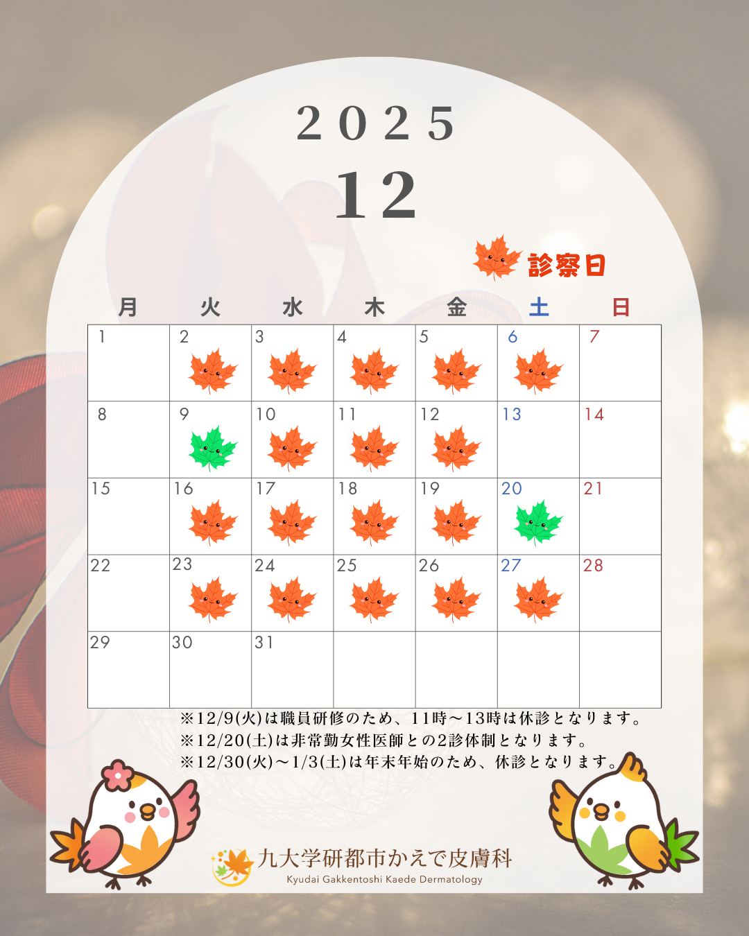 ・12/9(火):職員研修のため、午前は11:00までの診療となります。(午後は通常どおり14:00~)
